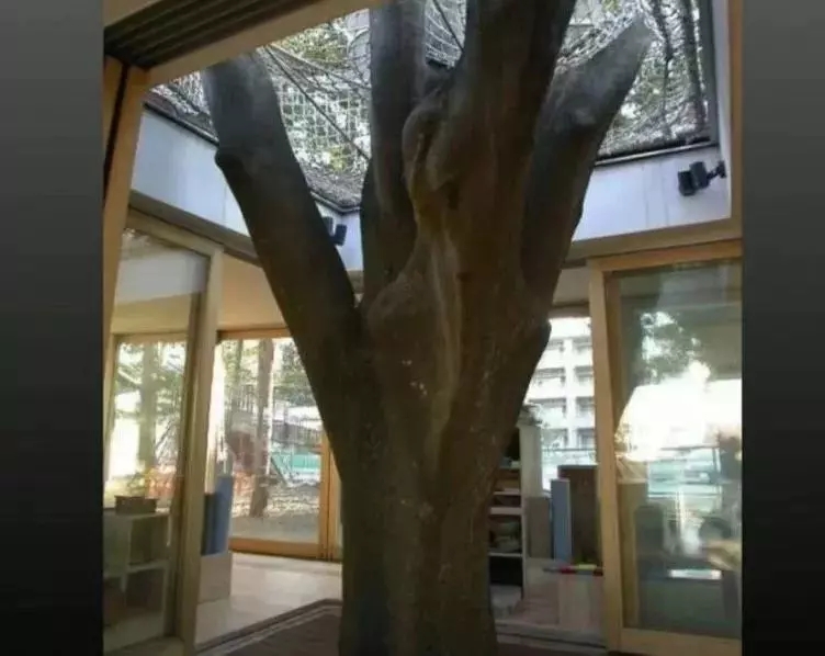設(shè)計(jì)之初,現(xiàn)場(chǎng)有三棵大樹,手冢夫婦不想砍掉他們,但是保留大樹就增加了建筑設(shè)計(jì)的難度,“如果把樹砍掉,小朋友就沒有東西轉(zhuǎn)圈玩。我們決定將大樹作為建筑的一部分進(jìn)行設(shè)計(jì),讓大樹從建筑中穿出。”