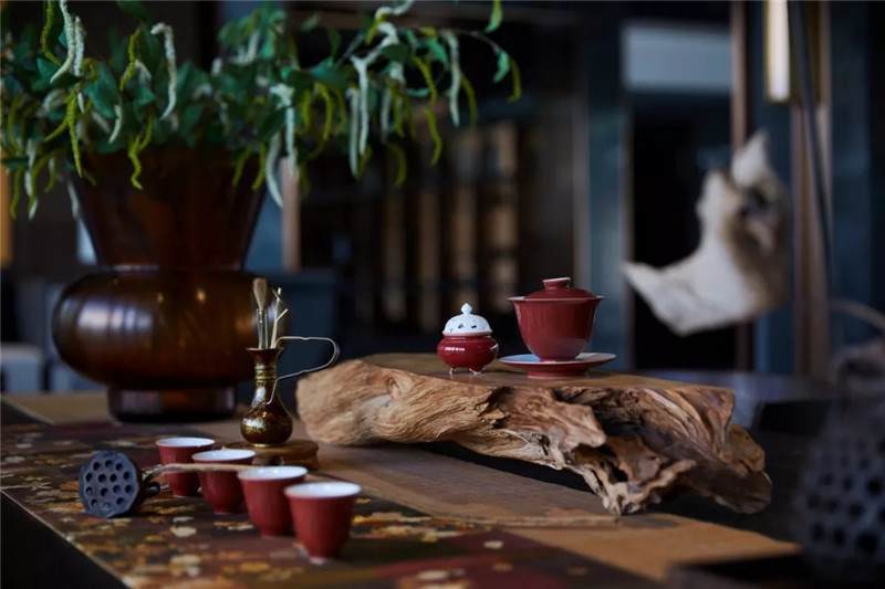 桌面借由點(diǎn)點(diǎn)紅綠添色,打破單調(diào),越發(fā)渲染生機(jī)與活力。兩端放置著極富水墨暈染狀的抽象畫(huà)作,以厚重的文化底蘊(yùn)來(lái)響應(yīng)當(dāng)下的時(shí)空與場(chǎng)域。