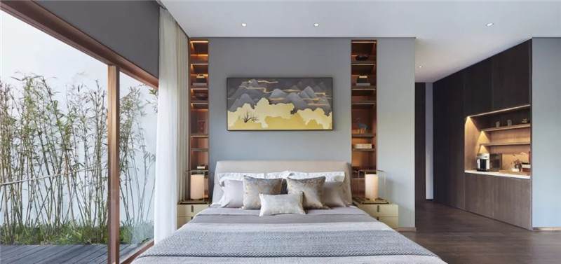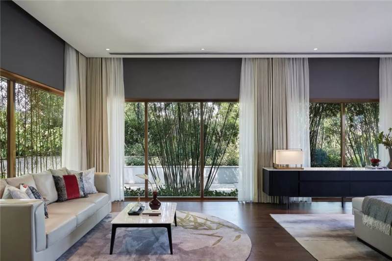 客房套間以現(xiàn)代簡(jiǎn)約風(fēng)范融入自然,呈現(xiàn)安寧愜意之境。設(shè)計(jì)師賦予其三面環(huán)景的奢享體驗(yàn),實(shí)現(xiàn)室內(nèi)與自然的對(duì)話(huà),物器與光影的互動(dòng)。