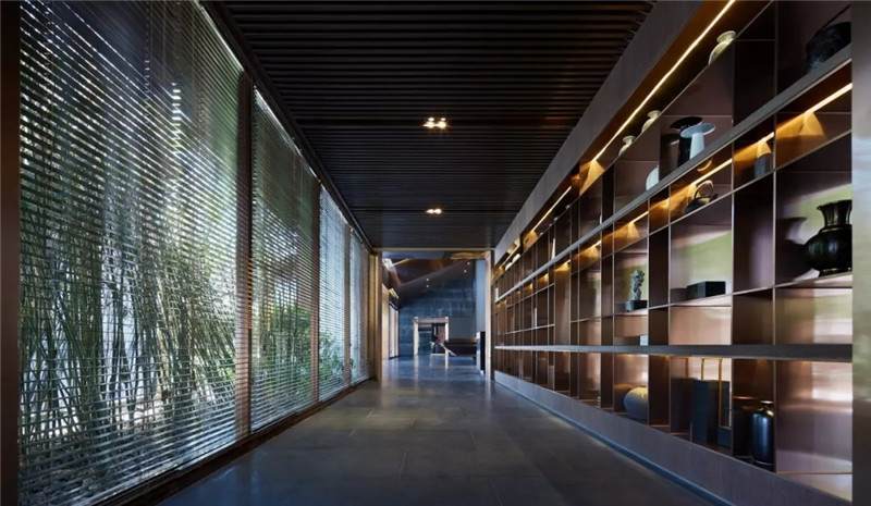 大堂西側(cè),全景落地玻璃及百葉搭配,加以園林框景手法,呈現(xiàn)意境之美、隱隱約約之效。穿回廊而過(guò),便見(jiàn)洽談區(qū),頓時(shí)豁然開(kāi)朗。