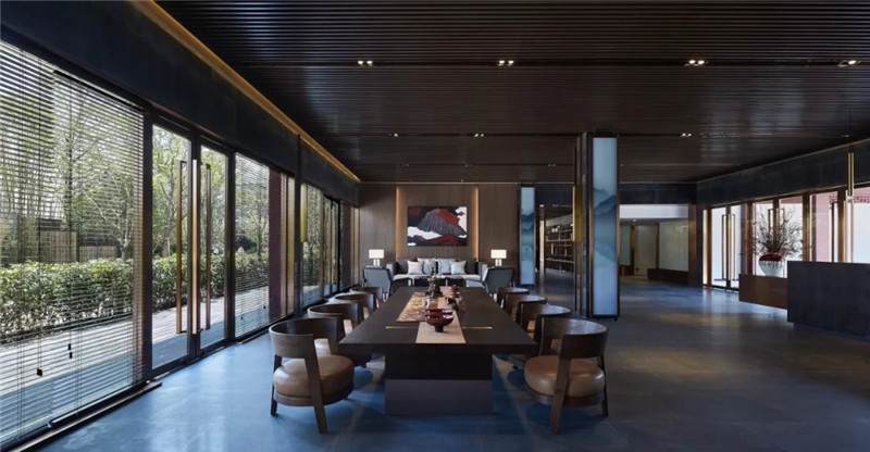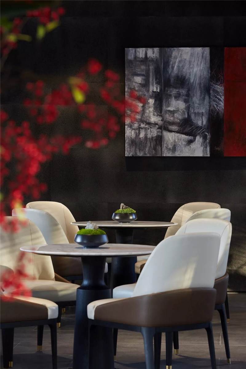 大堂內(nèi)注重材質(zhì)的克制與平衡,大面的黑色基底將儀式感與雄渾氣勢(shì)渲染而出。金屬鏤空格柵顯江南韻律,斜屋頂及頂端挑空區(qū)窗口,則是對(duì)傳統(tǒng)物態(tài)的解構(gòu)與再造。剝開(kāi)視覺(jué)表象,映射出來(lái)的是現(xiàn)代、東方、藝術(shù)、自然等內(nèi)核元素,給賓客無(wú)與倫比的感官體驗(yàn)。
