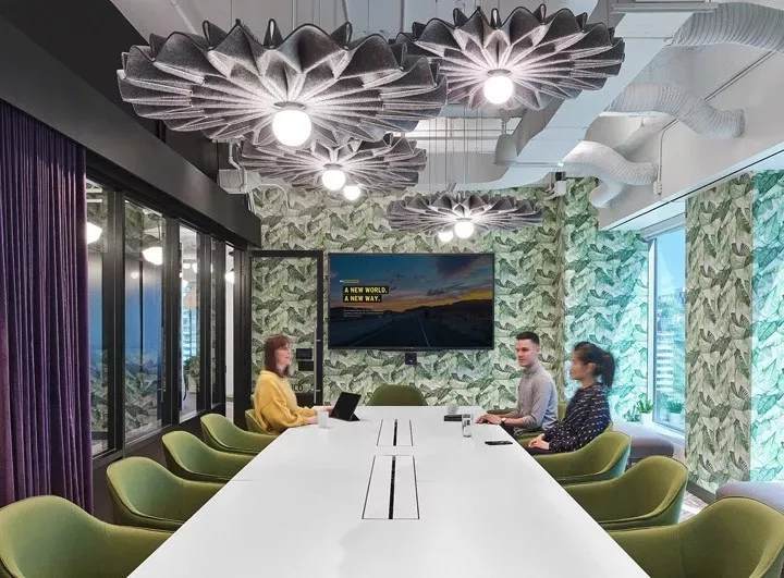 一間正式會(huì)議室,墻面鋪滿了綠色棕櫚葉墻紙,并配以綠色扶手軟椅,在綠色清新風(fēng)中,具有吸音性能的紫色布藝窗簾形成鮮明的色彩對(duì)比。毛氈聲學(xué)燈具BuzziPleat更是為整個(gè)空間錦上添花,帶來(lái)美美的視覺(jué)。