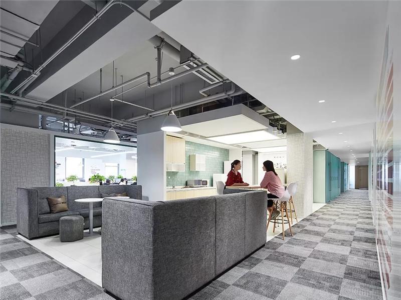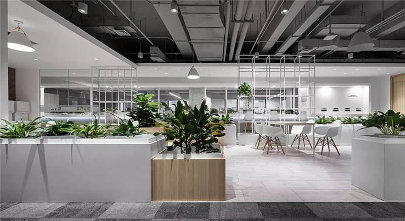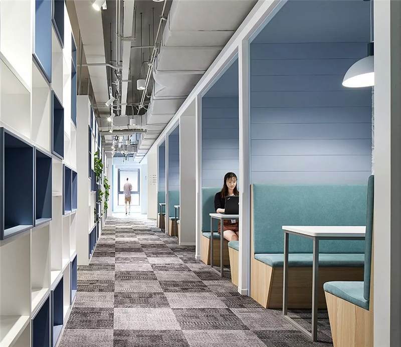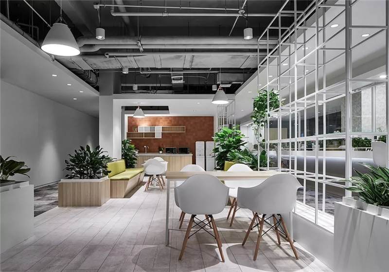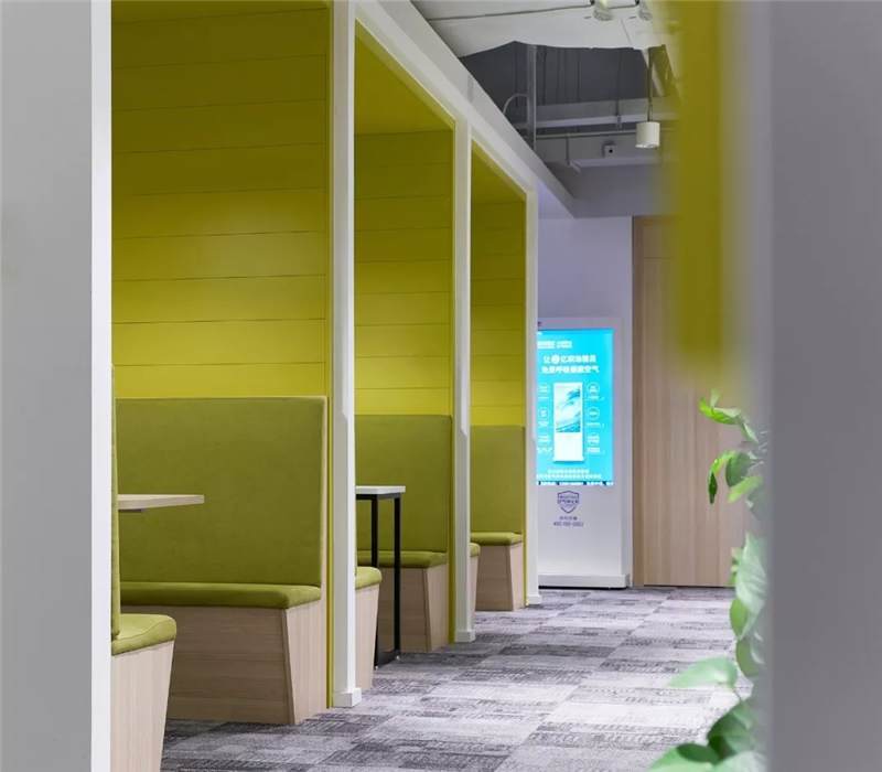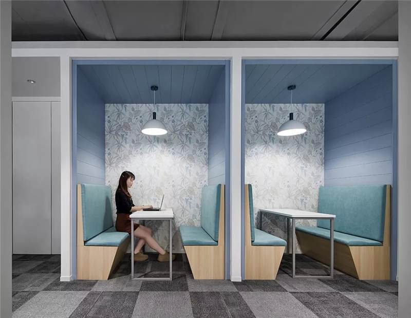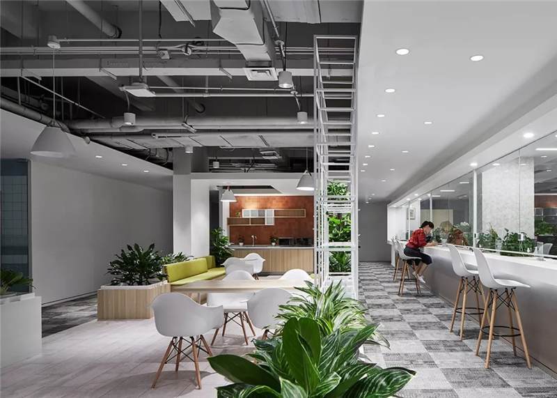 3-6層的各事業(yè)部及旗下子公司辦公層,設(shè)計(jì)師沿著核心筒打造環(huán)形的公共區(qū)域及溝通環(huán)廊帶,依次布置開放休憩洽談區(qū),電話亭,小型會(huì)議室,茶水間,衛(wèi)生間,涂鴉板等促進(jìn)溝通交流但界限模糊的混合功能區(qū),并采用卡座,綠植,通透金屬框架,玻璃配以貼膜,墻貼等方式營(yíng)造公共區(qū)域與辦公區(qū)之間的多層次關(guān)系,形成自由穿梭的辦公空間動(dòng)線。