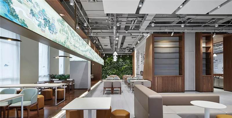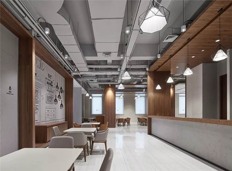 前廳左側(cè)穿越企業(yè)榮譽(yù)展示墻即是咖啡廳和用餐區(qū)??举|(zhì)家具圍合成不同的半私密性空間,黑色幾何線條吊燈及長(zhǎng)條形中國(guó)傳統(tǒng)園林山水飾面燈箱分別營(yíng)造出現(xiàn)代與古典相融的用餐氛圍。