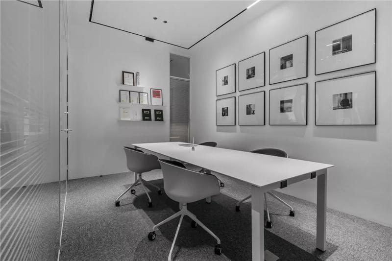 為了同時保證隱私和透明,張馳有道。會議室采用了玻璃+百葉窗的設計,這樣的交流區(qū)域保持彼此的通透與聯(lián)接,提升了場所的張力。使用貼合設計的局部掛畫藝術,配以金屬的深邃感官,多媒體影視裝置加強了墻面空間的信息輻射作用。