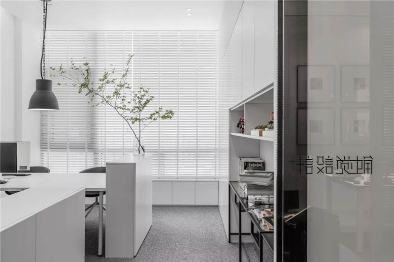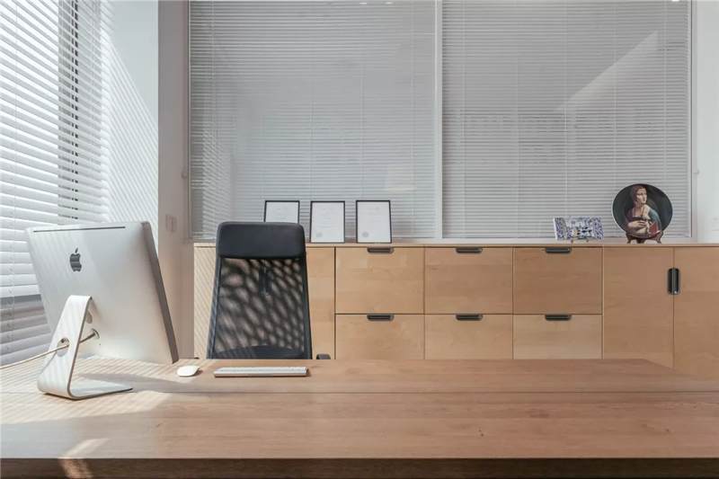 自由無拘的溝通對于團隊的創(chuàng)新至關重要。開放的辦公區(qū)是有效獲取信息和激發(fā)靈感的地方。百葉窗折射的光影,充足的自然光營造高效的工作環(huán)境??臻g雖然有限,但發(fā)揮最大的性能,開辟出一整面的軟裝材料搭配區(qū)。