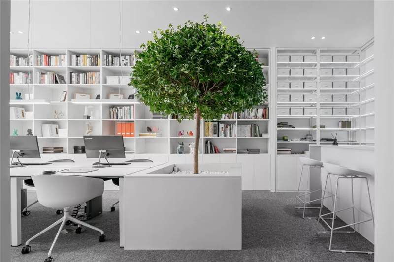 在這里,未知的一切與既有的常識記憶產生傳導,想象思維的觸角開始蔓延。小株綠樹分隔出挑高的白色高座式二人桌,提供了一種更為隨性、更利于面對面交流的辦公形式。