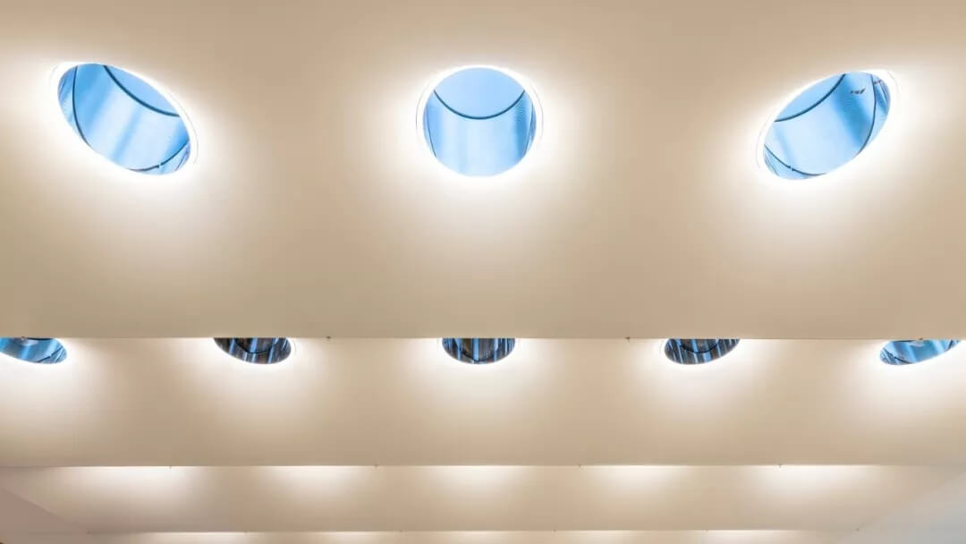 這個(gè)半透明的磨砂天窗,只允許自然光進(jìn)入。隨著自然光的變化,天窗底的燈光也會(huì)隨之變化,使室內(nèi)一直保持良好的照明環(huán)境。
