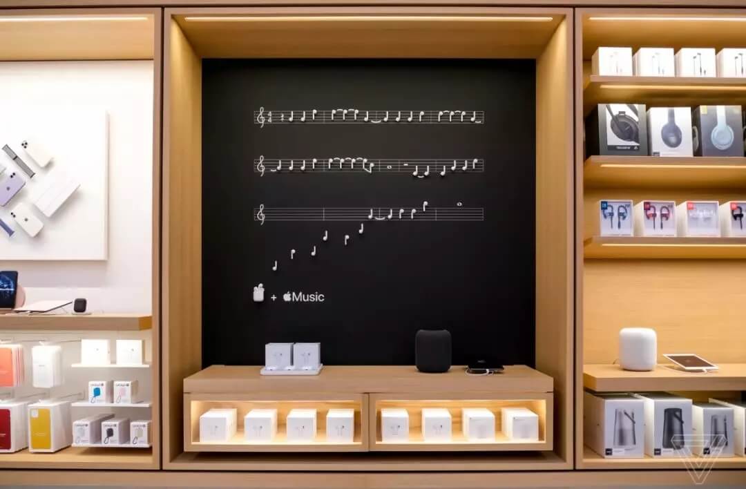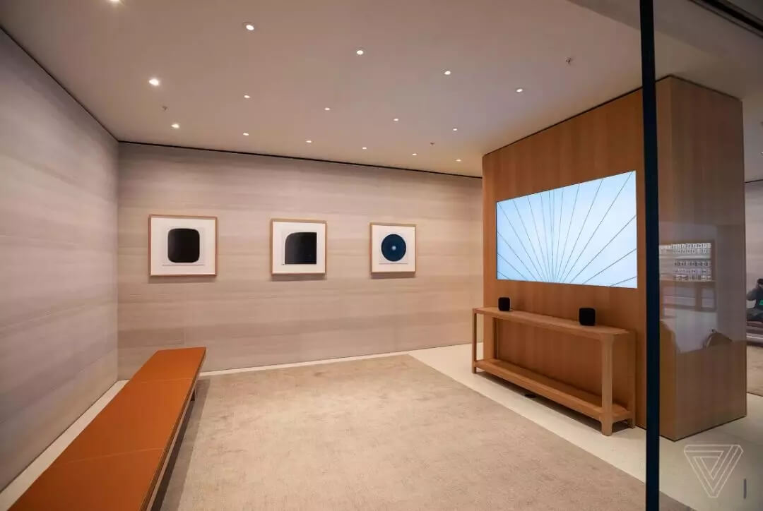 該店鋪內(nèi)重新設(shè)計(jì)了攝影大道,其背景墻適用于新款手機(jī)的拍照測(cè)試,這里也是世界上第一個(gè)開設(shè)專門展示AirPods的大道的商店。