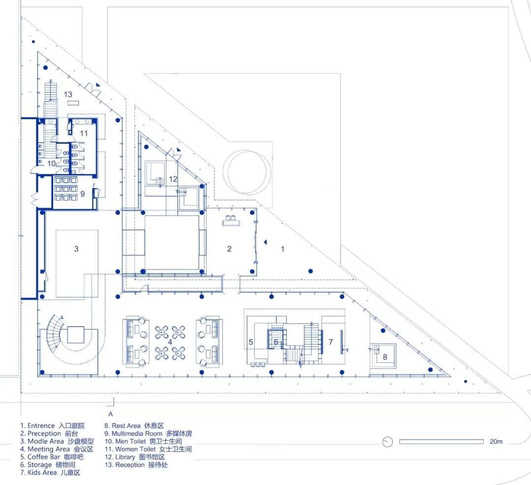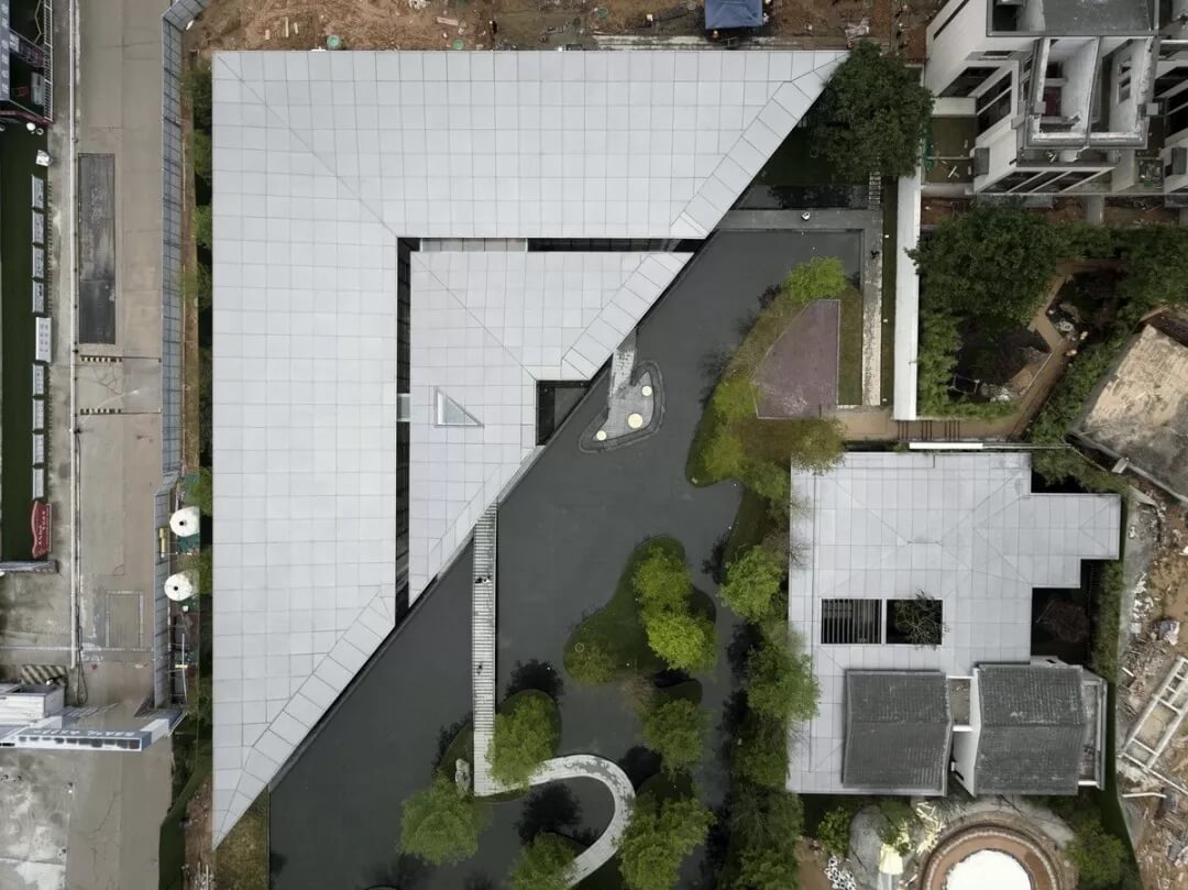 同時(shí),整個(gè)建筑運(yùn)用了現(xiàn)代構(gòu)圖的方式,突破了傳統(tǒng)對(duì)稱(chēng)的客家建筑特征,將多個(gè)同心半圓演化成多個(gè)相似三角形,構(gòu)成了不對(duì)稱(chēng)的幾何空間;巧妙地通過(guò)線(xiàn)與面的緩急對(duì)比加強(qiáng)了視覺(jué)上的層次感,以不同的設(shè)計(jì)手法,在保持建筑與外部交匯貫通的關(guān)系的同時(shí),強(qiáng)化了建筑的縱深感。