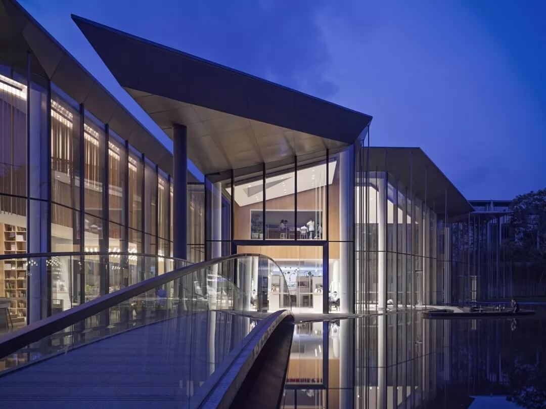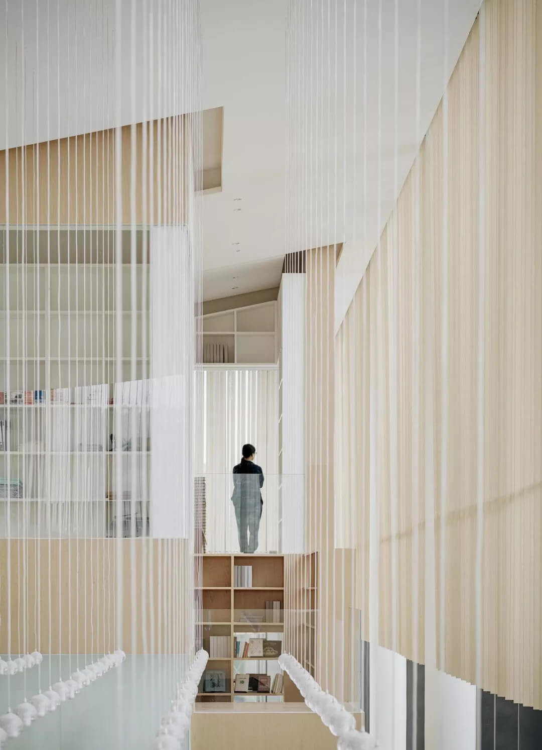 懸挑的頂棚引導(dǎo)游客進(jìn)入建筑內(nèi)部,映入眼簾的是錯(cuò)落分布著木質(zhì)懸浮盒子的雙層十米挑高空間。同時(shí)大面積的玻璃幕墻營(yíng)造的通透感,使得無(wú)論哪個(gè)方位,都具有內(nèi)外空間相通的視覺(jué)體驗(yàn)。隱藏在水池中的下沉休息區(qū),懸掛在天花上的木隔柵,穿插在旋轉(zhuǎn)樓梯和書(shū)架之間的休閑洽談區(qū),還有較為隱蔽私密的二層貴賓室,多個(gè)不同功能的空間仿佛彼此獨(dú)立,卻又渾然一體。