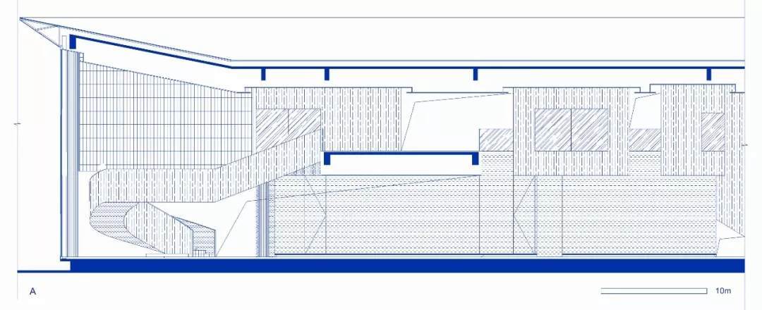為了適應(yīng)當(dāng)?shù)貧夂颍ㄖ熢谀弦黼p層通高的開(kāi)敞空間內(nèi)設(shè)置了懸垂的木隔柵,可以達(dá)到舒適的遮陽(yáng)效果,并且具有空間劃分的功能。公共洽談區(qū),雙層書(shū)架,咖啡吧就位于此。平行垂落且錯(cuò)落的木隔柵打破了安靜的空間氛圍,和室外的廊柱相互呼應(yīng)的同時(shí),密布的木隔柵也自身形成體量與二層的功能體塊虛實(shí)相生。