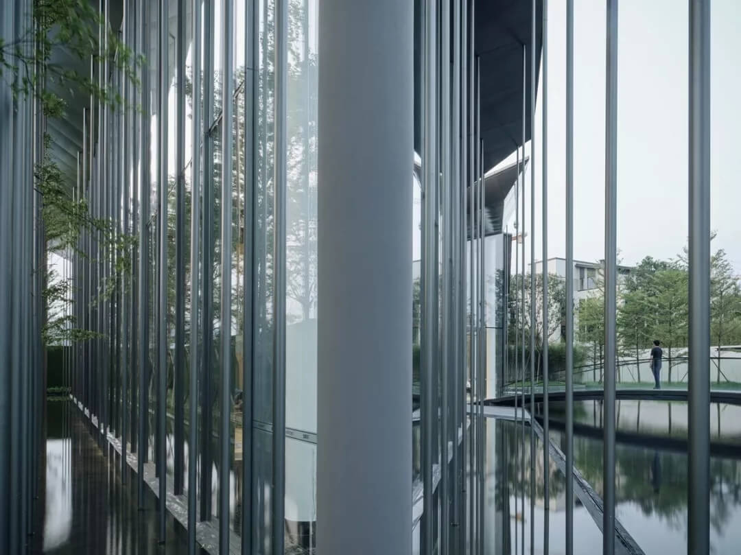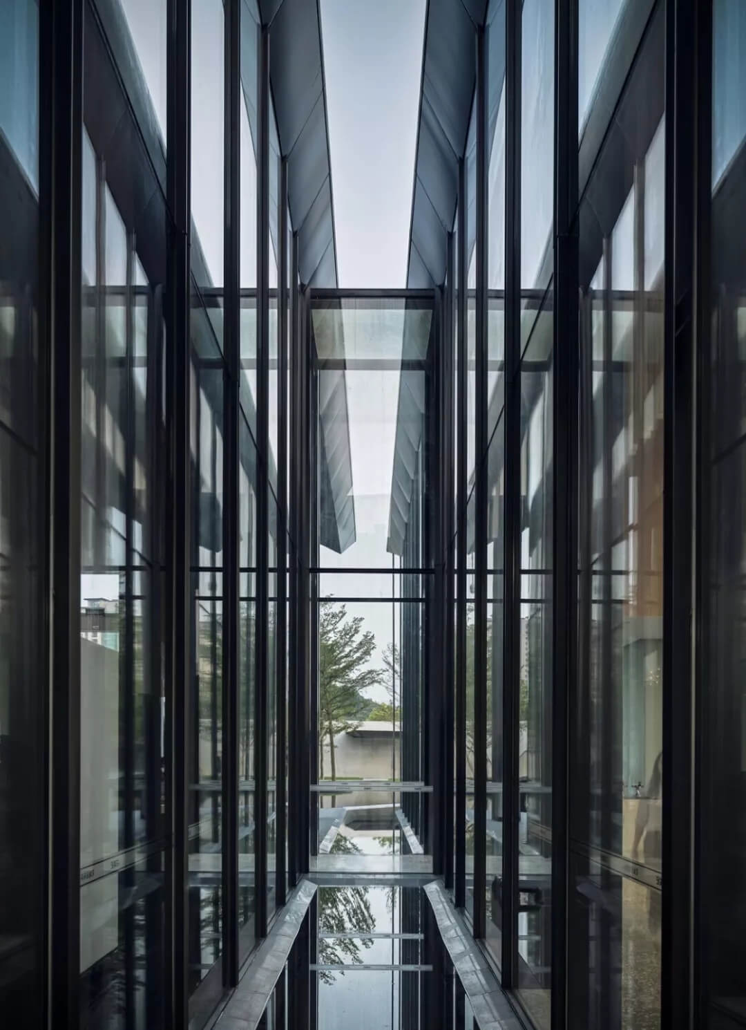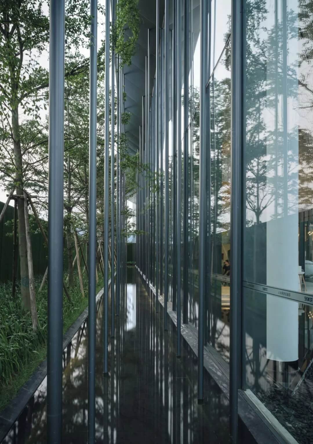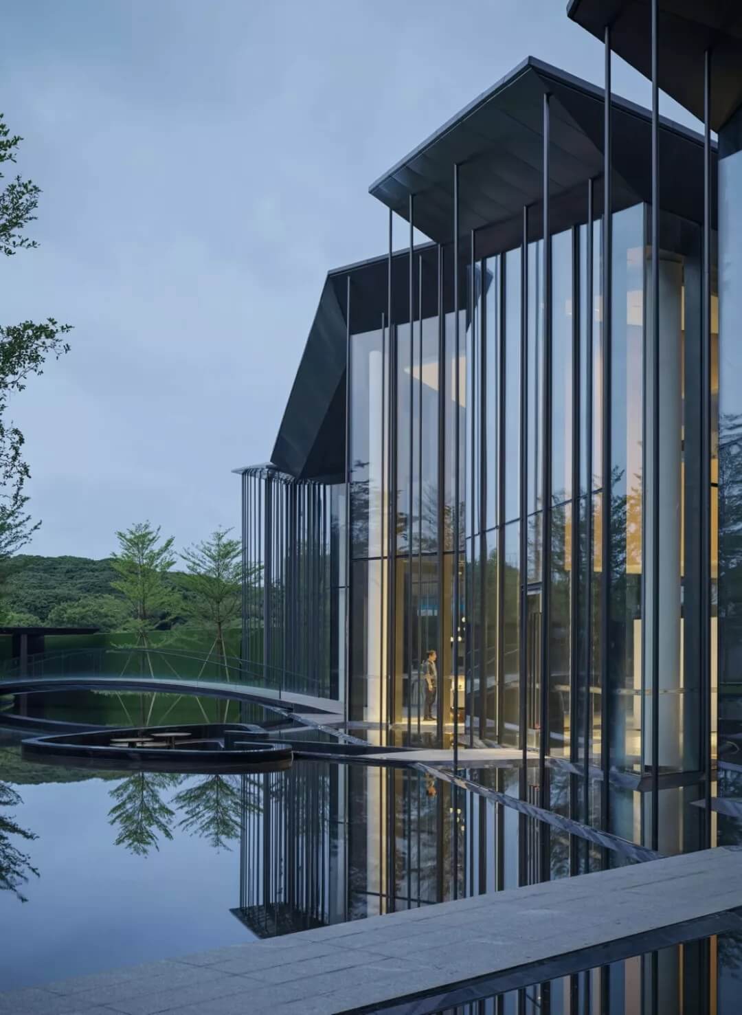 在這個(gè)項(xiàng)目中,建筑師嘗試用現(xiàn)代的理念、結(jié)構(gòu)和材料來(lái)打造由封閉走向開(kāi)放融合的客家建筑,創(chuàng)造出傳統(tǒng)文化和現(xiàn)代觀(guān)念相結(jié)合的建筑形態(tài)。如同客家建筑大多坐落于山水樹(shù)林間,這座雙層建筑與周?chē)匀痪坝^(guān)也保持著親密聯(lián)系。剪影式的三角形頂棚如同山的影子般遮蓋著地面;而支撐著整個(gè)三角屋頂?shù)慕饘僦韧鹑裘艿臉?shù)林,與戶(hù)外的樹(shù)木連成一片;環(huán)繞場(chǎng)地的水景弱化了由剛性的幾何平面帶來(lái)的疏離感,大面積的玻璃的應(yīng)用,引入周?chē)G色景觀(guān),重新定義了建筑與周邊的環(huán)境關(guān)系。莊重但不厚重的頂棚,高聳錯(cuò)落的柱廊,通透的落地玻璃,山與樹(shù)與水。