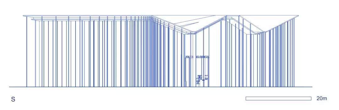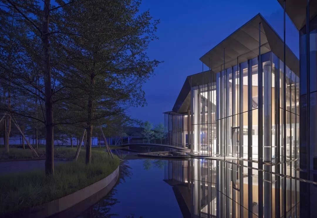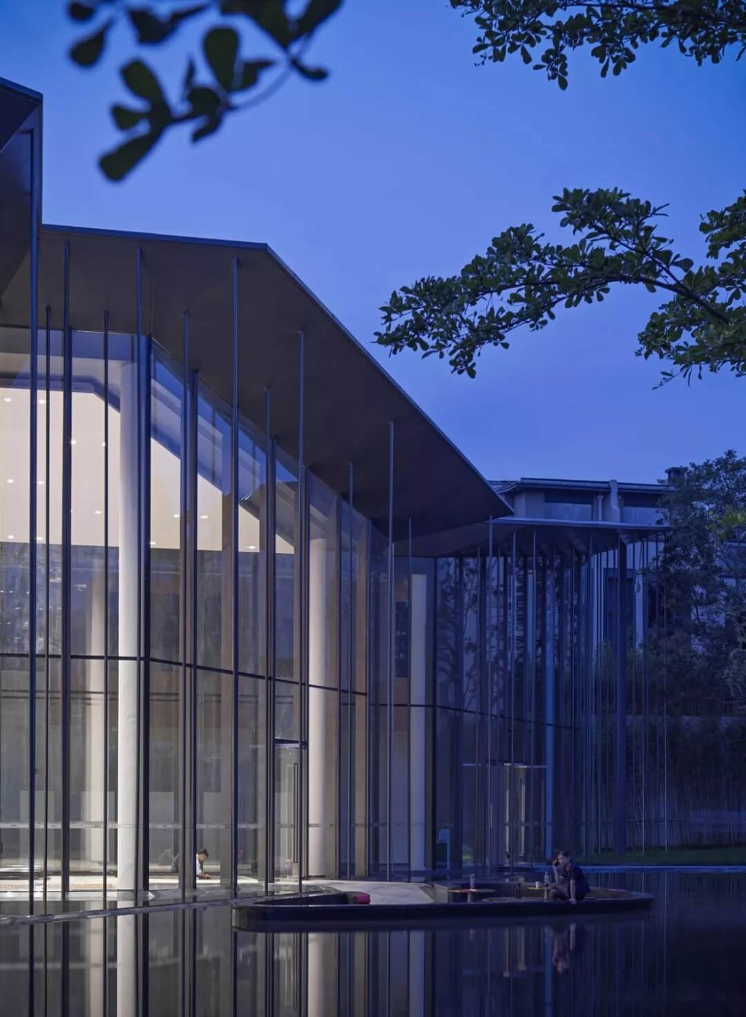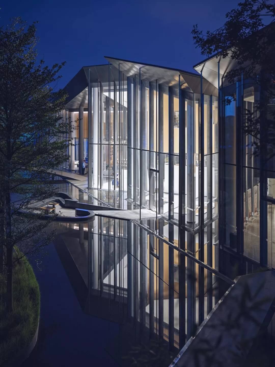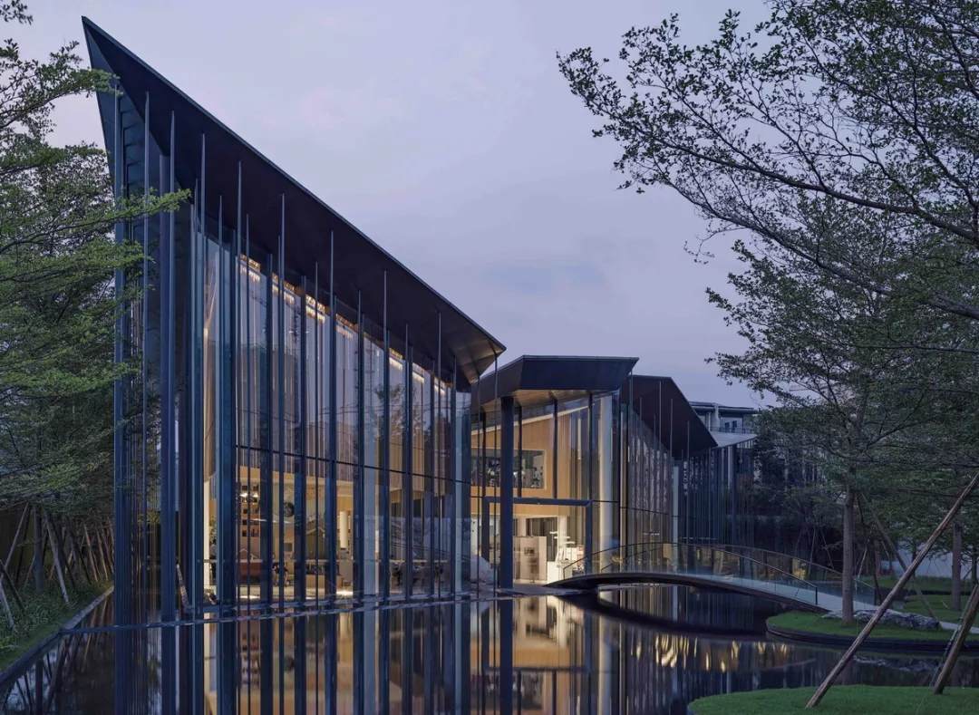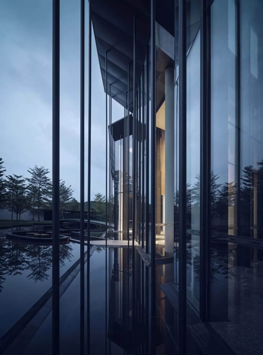 在這個(gè)項(xiàng)目中,建筑師嘗試用現(xiàn)代的理念、結(jié)構(gòu)和材料來(lái)打造由封閉走向開(kāi)放融合的客家建筑,創(chuàng)造出傳統(tǒng)文化和現(xiàn)代觀(guān)念相結(jié)合的建筑形態(tài)。如同客家建筑大多坐落于山水樹(shù)林間,這座雙層建筑與周?chē)匀痪坝^(guān)也保持著親密聯(lián)系。剪影式的三角形頂棚如同山的影子般遮蓋著地面;而支撐著整個(gè)三角屋頂?shù)慕饘僦韧鹑裘艿臉?shù)林,與戶(hù)外的樹(shù)木連成一片;環(huán)繞場(chǎng)地的水景弱化了由剛性的幾何平面帶來(lái)的疏離感,大面積的玻璃的應(yīng)用,引入周?chē)G色景觀(guān),重新定義了建筑與周邊的環(huán)境關(guān)系。莊重但不厚重的頂棚,高聳錯(cuò)落的柱廊,通透的落地玻璃,山與樹(shù)與水。