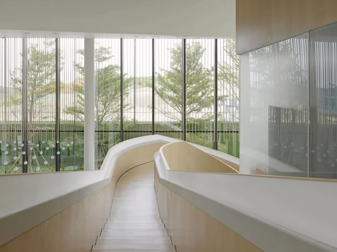 在直線(xiàn)構(gòu)成的空間中,設(shè)計(jì)師巧妙地設(shè)置了一個(gè)旋轉(zhuǎn)樓梯,經(jīng)過(guò)鋼結(jié)構(gòu)精確的計(jì)算,運(yùn)用了非柱支撐的結(jié)構(gòu)連接于兩層間。游客可以通過(guò)此旋轉(zhuǎn)樓梯到達(dá)二樓的貴賓室和辦公室,透過(guò)具有框景效果房間窗戶(hù)向外望出,看到室內(nèi)各部的同時(shí)亦可以觀(guān)賞周邊風(fēng)景。