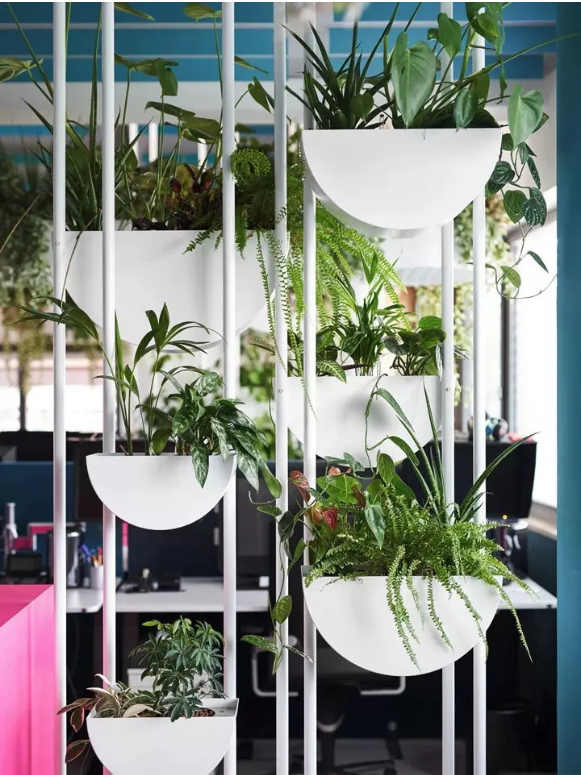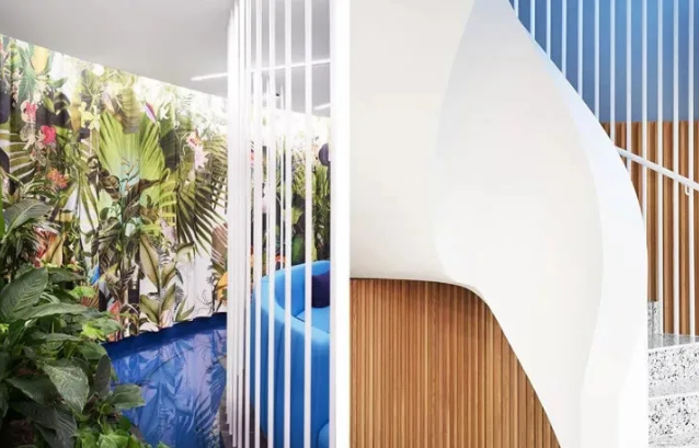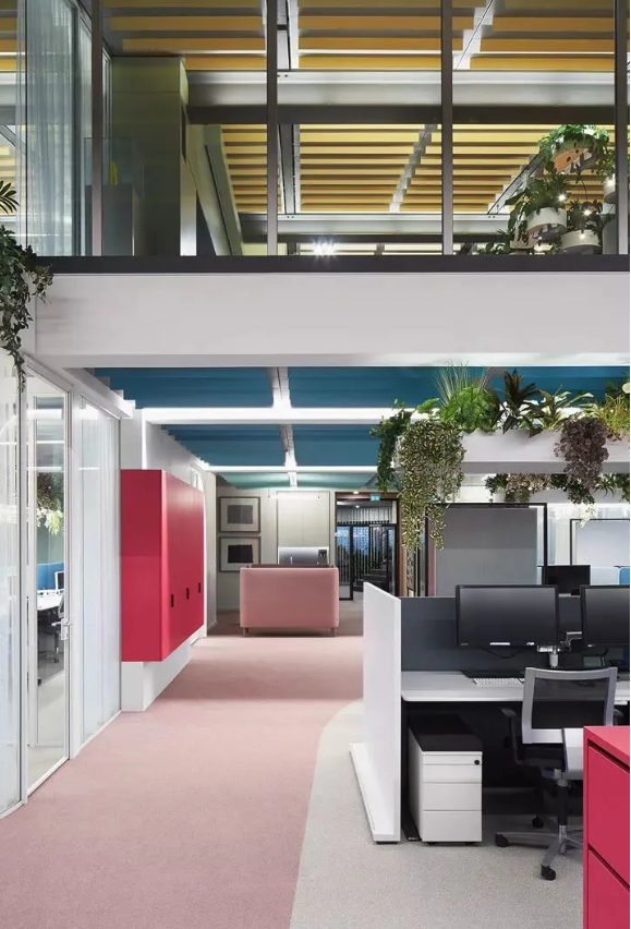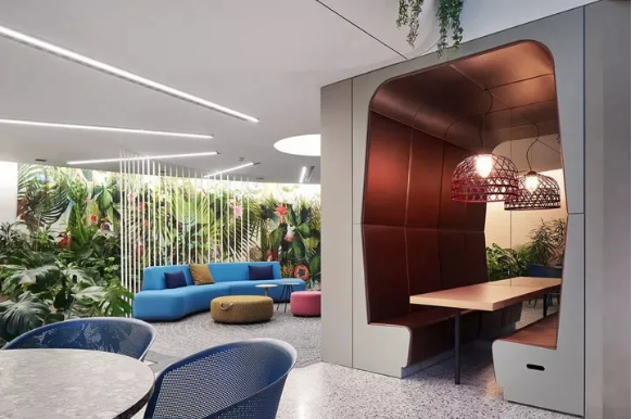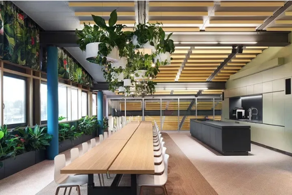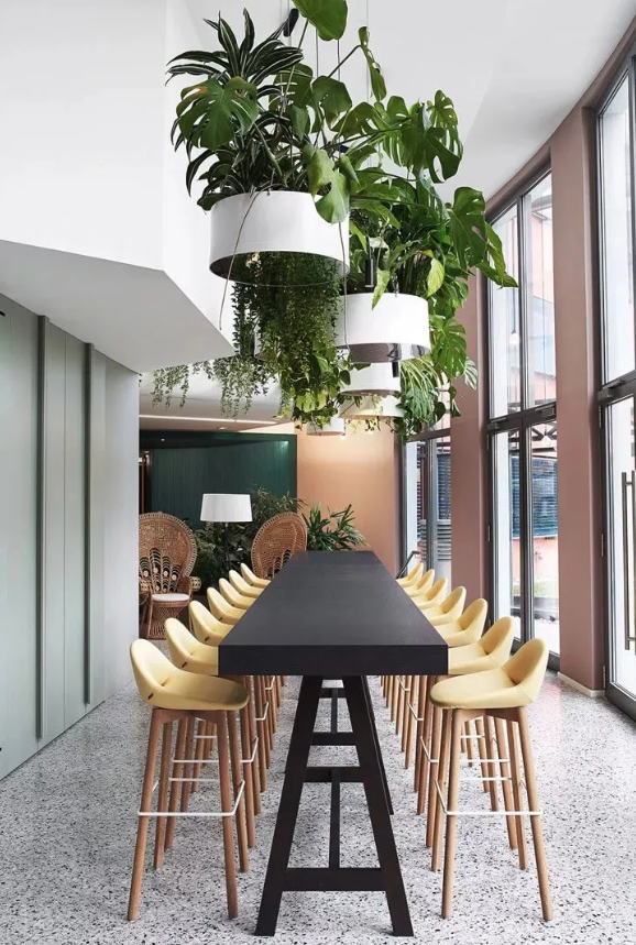 首先,設(shè)計(jì)團(tuán)隊(duì)為這處工作場(chǎng)所增添了2100個(gè)超級(jí)盆栽植物。綠植能產(chǎn)生良好的情緒、降低精神壓力、促進(jìn)創(chuàng)新、提高績(jī)效。此外,綠植還能改善空氣質(zhì)量、營(yíng)造健康環(huán)境,并起到降噪的作用。它們只需定期澆水就能保持茂盛狀態(tài),因此深得人心。室內(nèi)盆栽植物具有強(qiáng)大的正能量。自從加入了這些綠化,室內(nèi)濕度不僅從18%增加到44%,讓人們的體感非常舒適,連員工的病假都減少了一半!