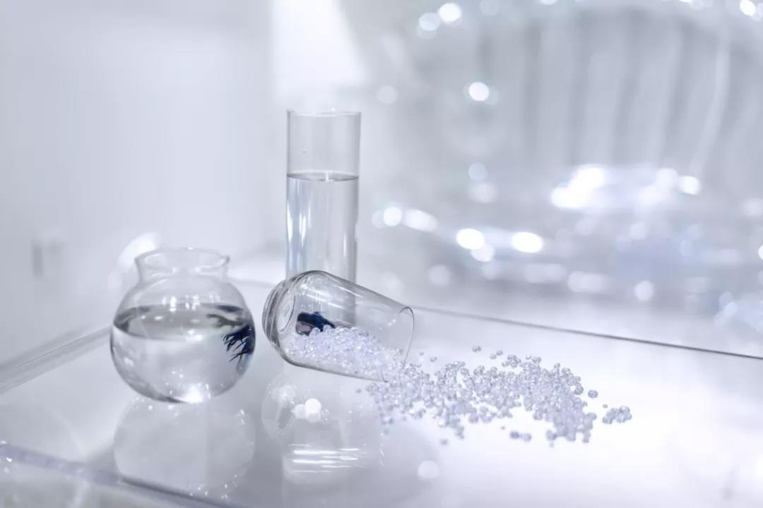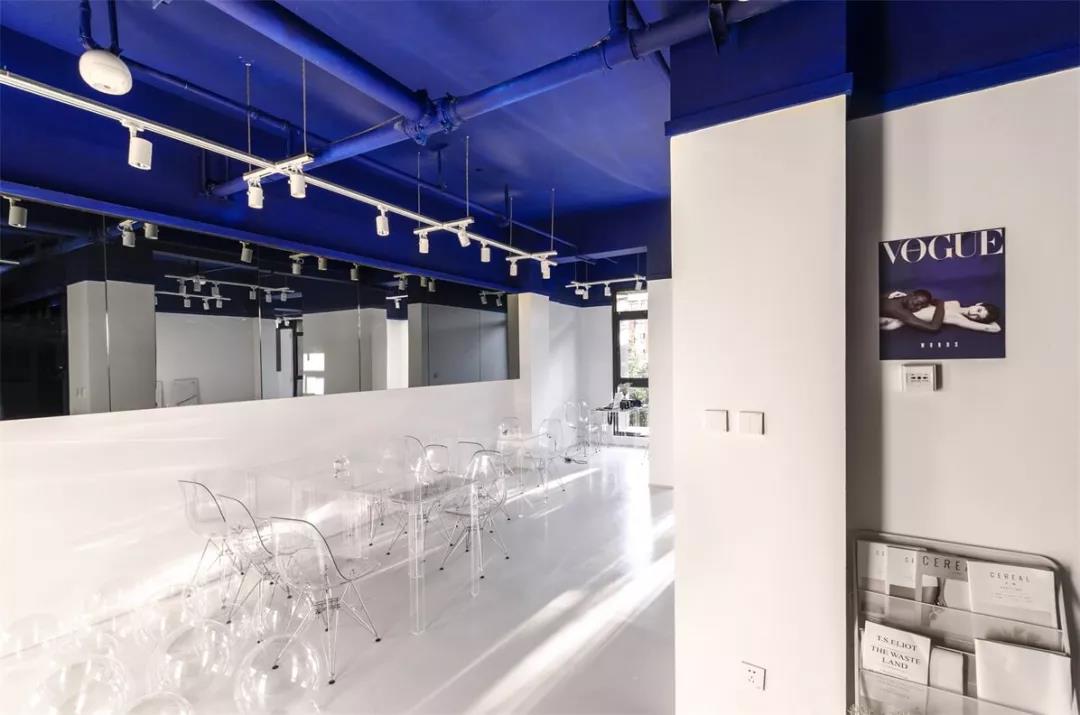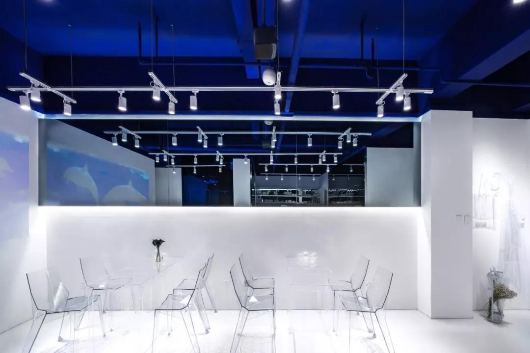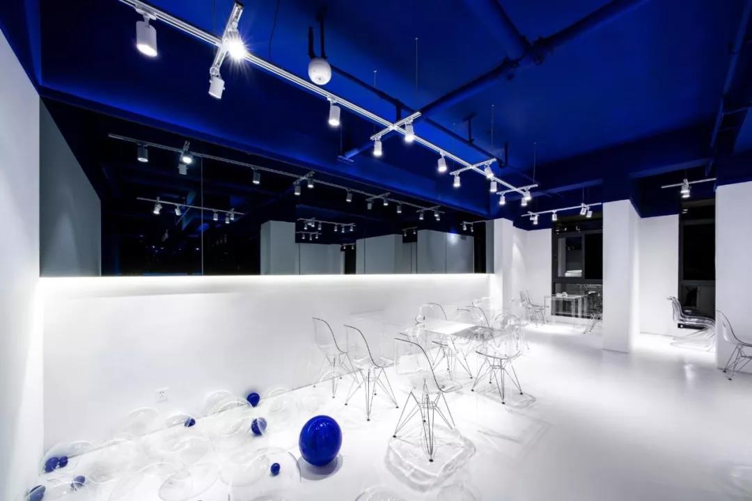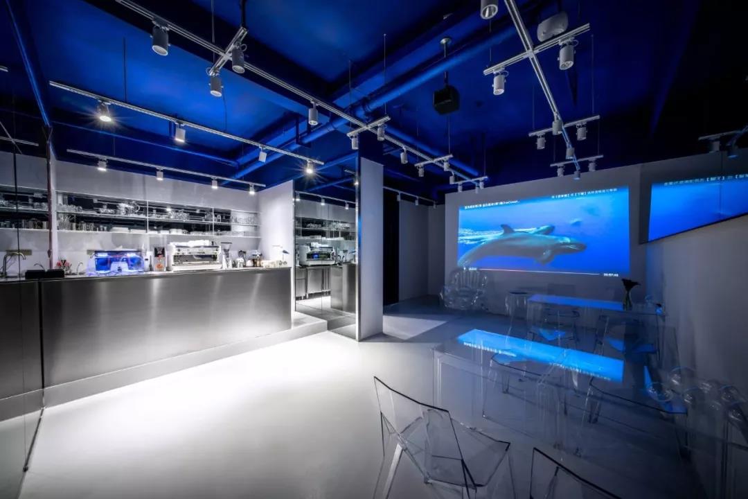 帶著這樣的邏輯,整個(gè)空間的設(shè)計(jì)就很明確了,拆除原有的吊頂,用涂料做成藍(lán)色的“天空”;下面的空間則使用帶有反射性/透明性的材料——鏡面、金屬、亞克力、塑料等,通過(guò)這種曖昧的委婉的,而非簡(jiǎn)單粗暴的方式,讓深海的藍(lán)色充滿整個(gè)空間。