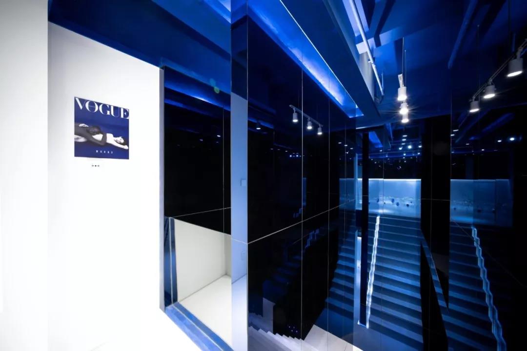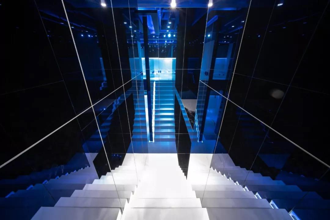 鏡面材質(zhì)方面,大面積使用的玻璃鏡面增加了空間的延伸感和開(kāi)闊性,而鏡面的安裝則在通過(guò)多層板固定在墻面,并且鏡面外邊框則通過(guò)多層板開(kāi)暗槽暗藏了LED燈帶創(chuàng)造出鏡面懸浮在空中的效果。設(shè)計(jì)中出現(xiàn)了普通的灰鏡以及在樓梯空間部分為了強(qiáng)調(diào)反射效果而采用的藍(lán)鏡,樓梯空間的大面積鏡面配合不同地方的光源、以及藍(lán)色頂面不同層次的漫反射創(chuàng)造出一種夢(mèng)幻的效果。