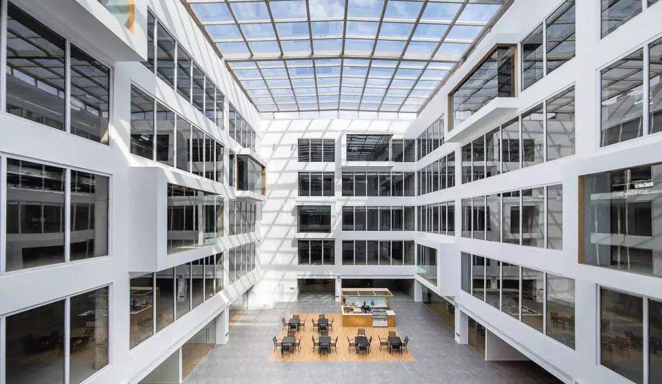 為了改善主要公共區(qū)域的動線,設計加大了報告廳和中庭的入口面積。另外還在大堂增設了一個旋轉樓梯,導引訪客從首層直達二層中庭。為了在公共走廊和中庭之間增加透明度,大部分會議室設置在二樓的中庭兩側,同時也增加公共中庭的活動。中庭還設有一個小咖啡廳,租戶和游客可休息和相互見面。