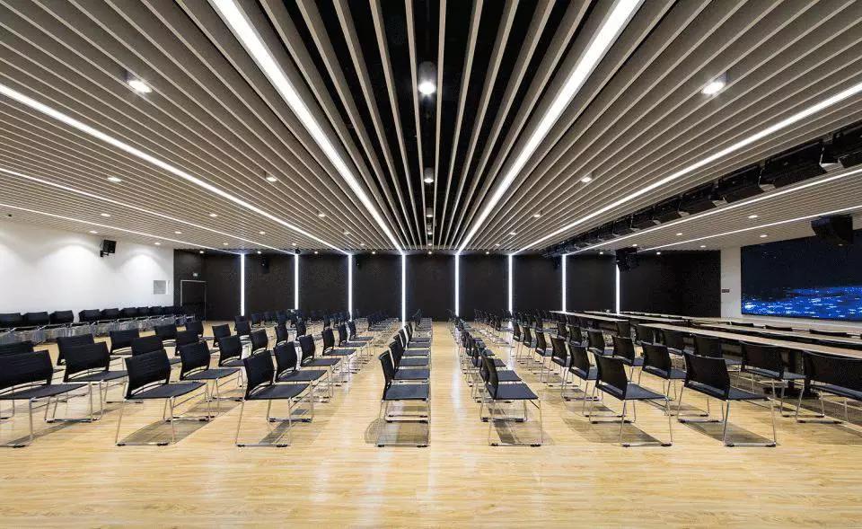 不同的空間內容對應不同的材質氛圍,從色彩到質感,再到意象化的裝飾,我們依據(jù)大堂、會議、休息室、中庭等不同空間尺度與空間內容營造新穎豐富、恰如其分的空間氛圍。溫暖的木色、混凝土板、白色大理石和白色乳膠漆為主要材料,其中報告廳大異其趣,優(yōu)雅高貴的深灰色布藝軟包與報告廳的相對集中和封閉性相得益彰。我們依托原有建筑空間序列,如大堂-電梯廳-等候區(qū)-多功能廳-VIP室-展廳,調整改變室內設計的溫度與濃度,為原本純功能理性化的空間組織蒙上一層魅力面紗,讓功能化的“經過”變?yōu)橐淮尾簧岬鸟v留與感受。