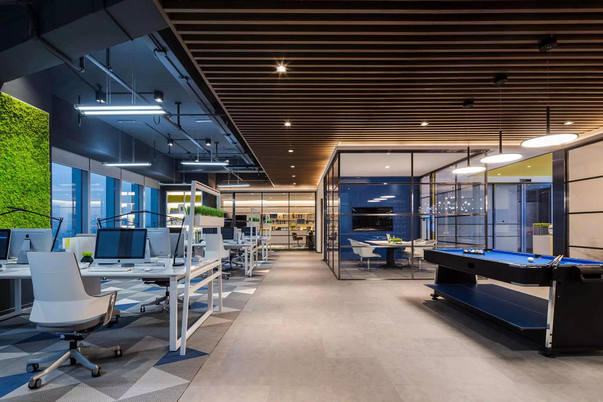 裸露的天花與木格柵的設計,形成反差,重點突出了原建筑的空間感,與時下設計熱點相適應;臺球的細節(jié)設計,體現了公司對員工精神層面上的關懷,工作之余,還可打一桿臺球放松身心。