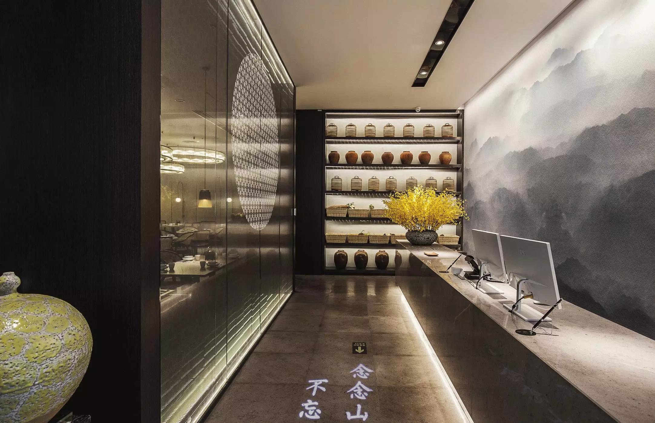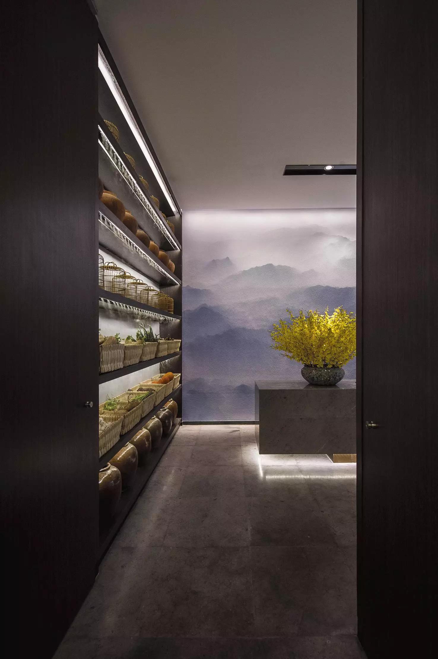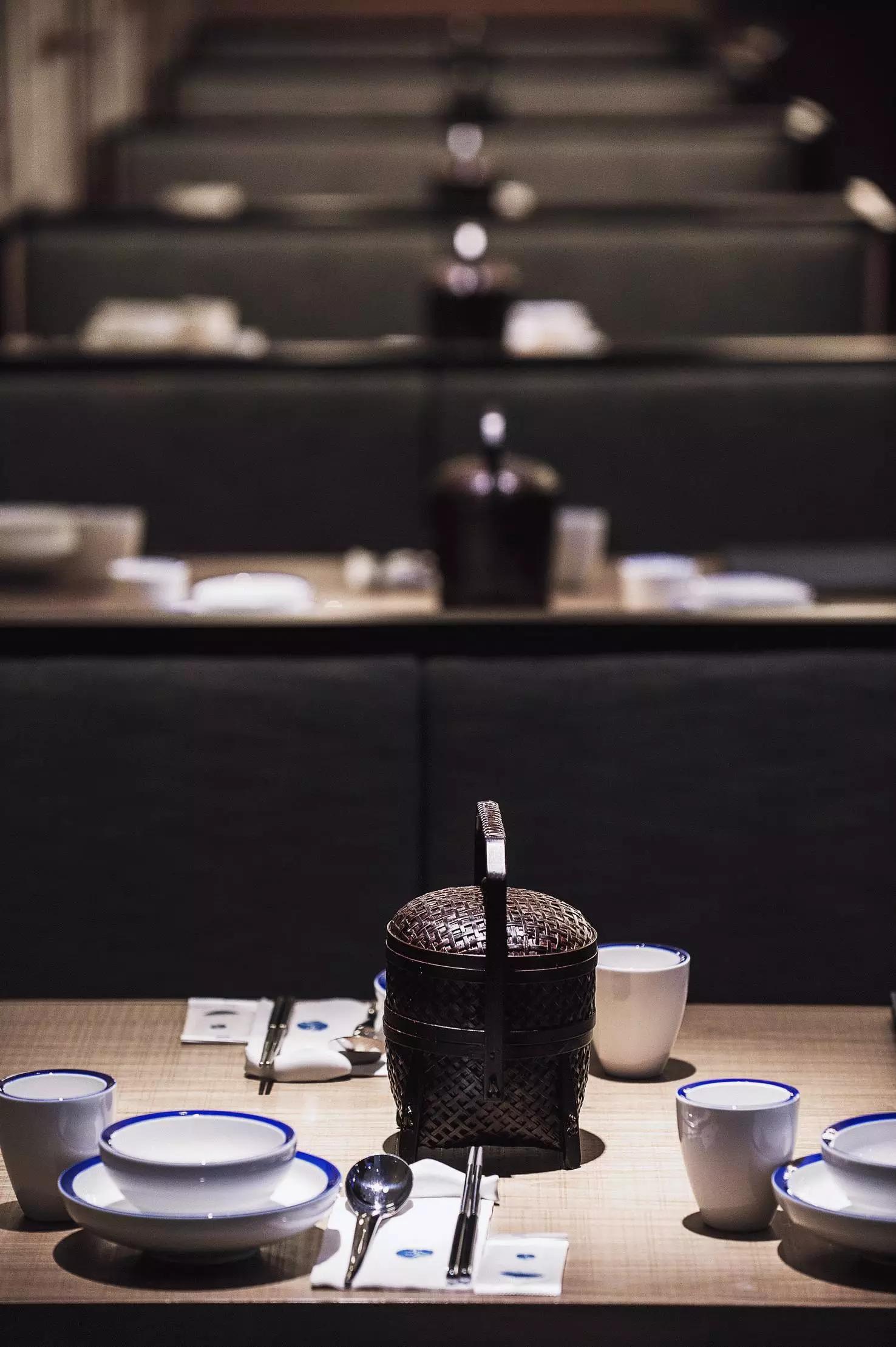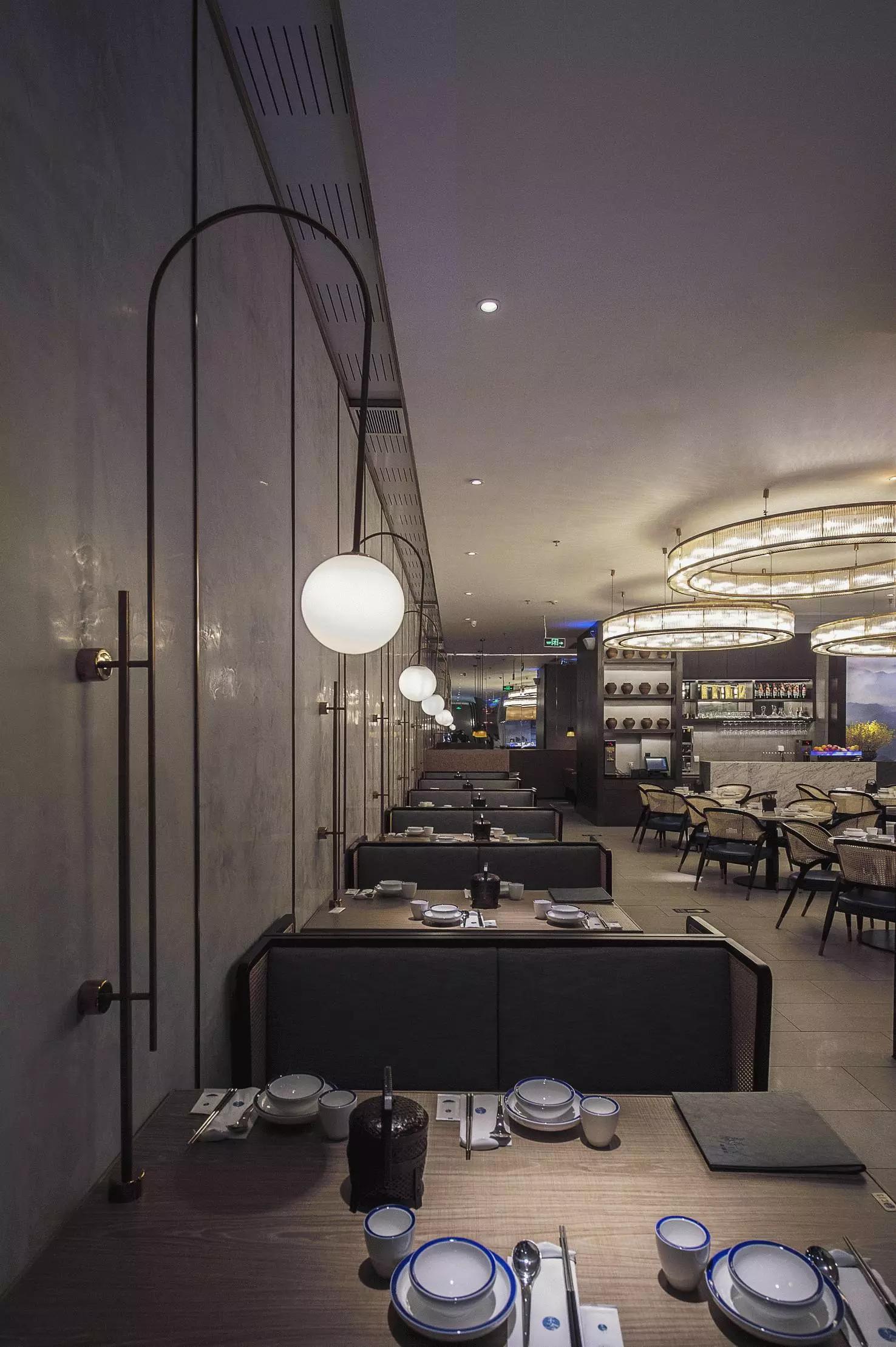 設(shè)計(jì)中廣泛使用了灰藍(lán)色調(diào)的石材,地磚,皮革,墻板,結(jié)合清新的藤編,厚重的木材,充滿質(zhì)感的不銹鋼以及別致的燈具和光線,讓整個(gè)空間既清新優(yōu)雅又不失質(zhì)樸,讓人雖身處鬧市卻仿佛置身于海的廣渺與山的深幽,又始終籠罩在一層淡淡的氤氳不去的“鄉(xiāng)愁”之中。